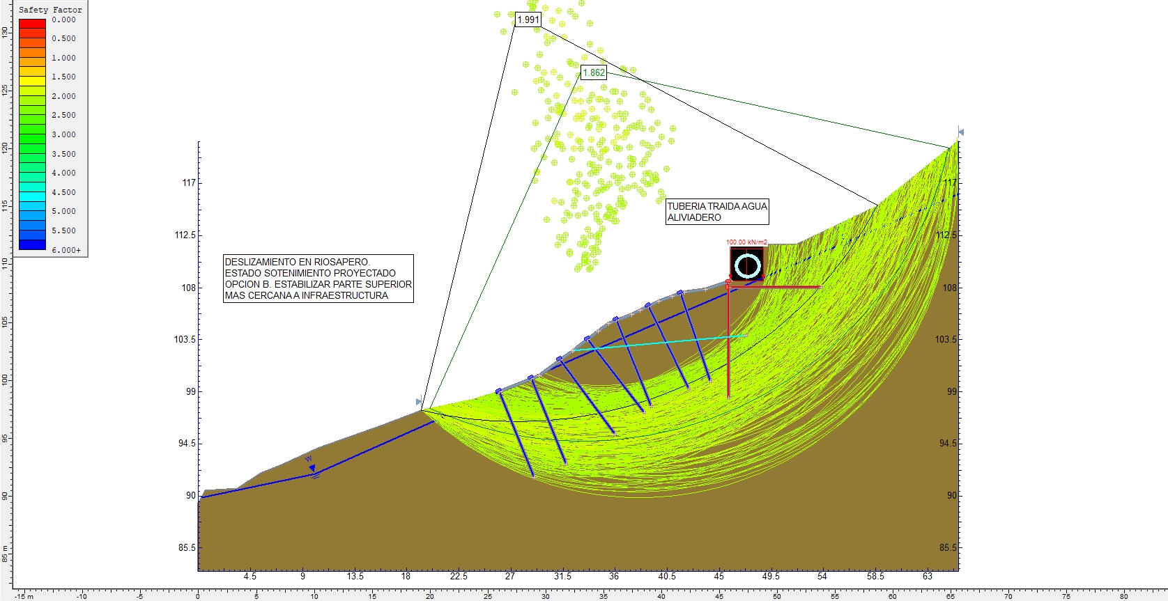 - red de cable con luz 300 x 300 mm con un tamaño de paño de 3×3 y una malla de bulones de 3 x 3 m de diámetro 32 tipo Gewi, con una longitud de 8 metros perpendiculares a la superficie de cara del talud) en toda la superficie con un sobreancho de 10 metros a cada lado del deslizamiento actual.