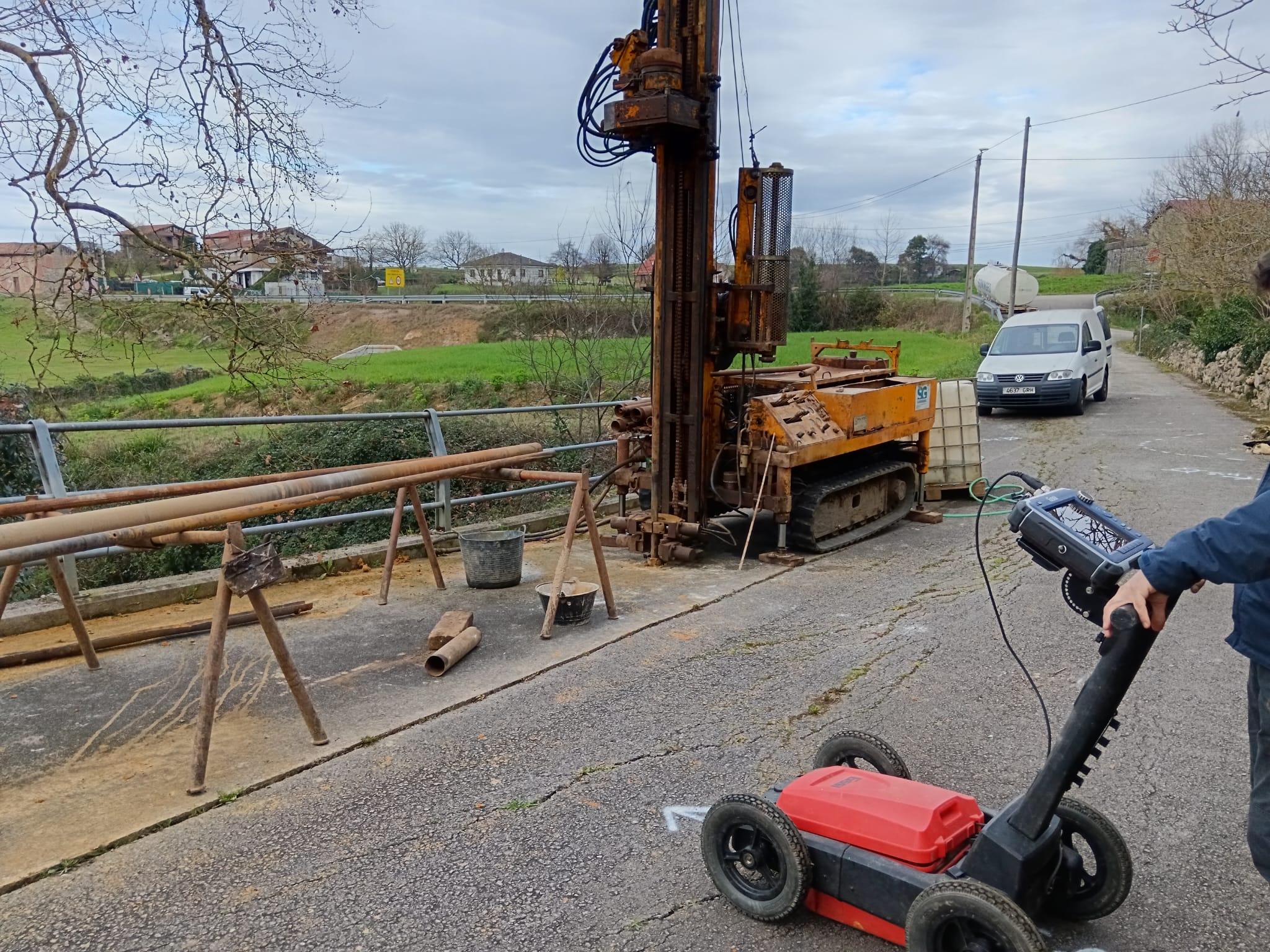 Así, desde Soningeo estamos ejecutando una batería de sondeos mecánicos con extracción de testigo continuo realizando ensayos in situ de resistencia y colocando tubería piezométricay arqueta transitable, empleando uno de nuestros equipos hidráulicos montados sobre oruga de goma tipo Rolatec 48L. El suministro de agua para la realización de los sondeos se realiza mediante nuestra cuba cisterna de 8.000 litros montada sobre camión Multilif utilizando agua reciclada.