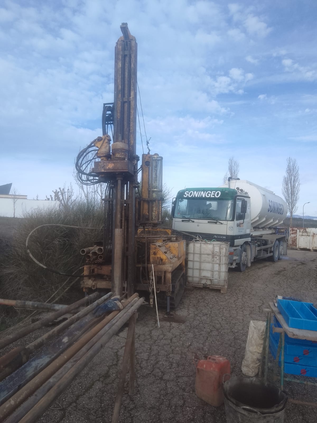 Los sondeos están siendo realizados mediante sonda hidráulica montada sobre orugas, tipo Rolatec 48L, con suministro de agua mediante nuestra cuba montada sobre camión de 10.000 litros, usando agua reciclada.